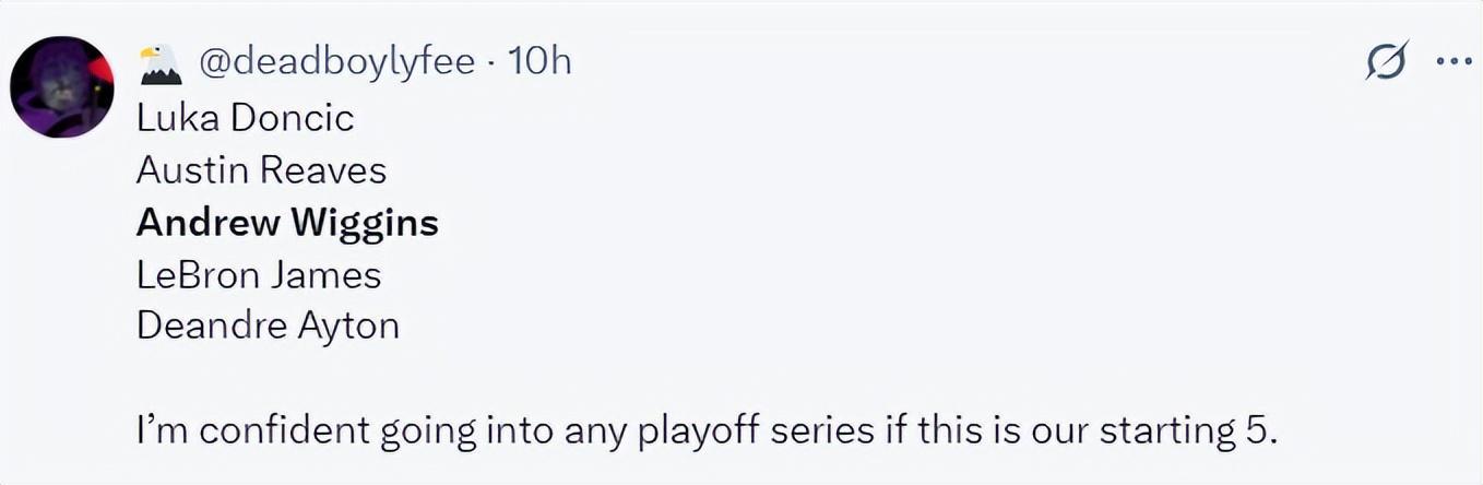 湖媒还写道:如果我们有这样一套先发东契奇、里夫斯、维金斯、詹姆斯、艾顿,我认为我们在季后赛可以赢下任意一轮系列赛。