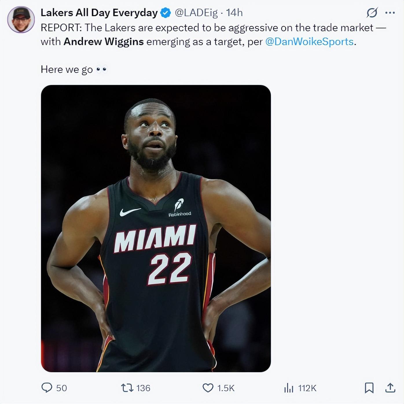 《体育画报》也跟踪报道,湖人队有意交易得到维金斯,热火队想要得到湖人队的首轮签而不是克内克特。